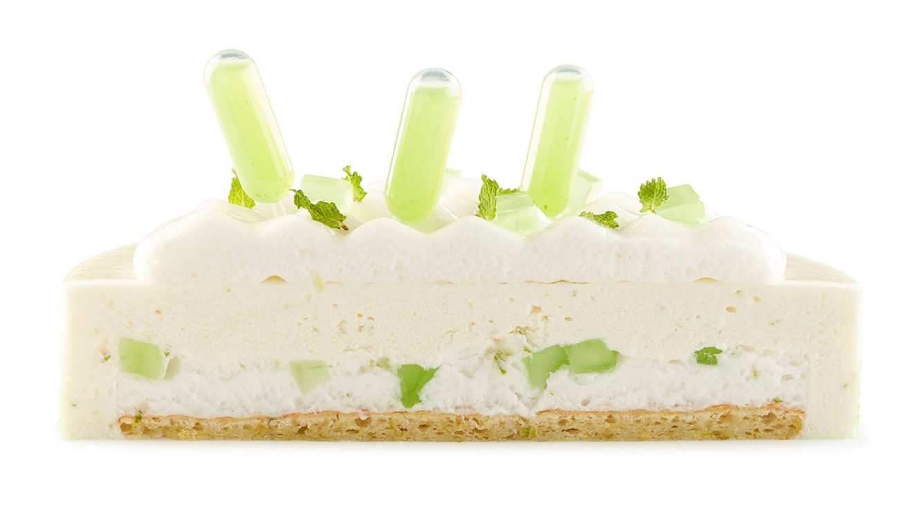 Una de las recetas que forman nuestro entremet Mojito es un cremoso hecho de ron y puré de lima. El cremoso se prepara gelificando primero el puré, el agua y la solución de ron. Después, añadimos el azúcar moreno y la goma garrofín –para evitar la sinéresis–. Al final, mezclamos esta preparación con aceite de coco, un emulsionante (Natur Emul) y las hojas de menta. Por otro lado, también encontramos la receta de la mousse de lima y ron en la que seguiremos el mismo proceso, pero en lugar de aceite de coco, añadiremos el merengue.