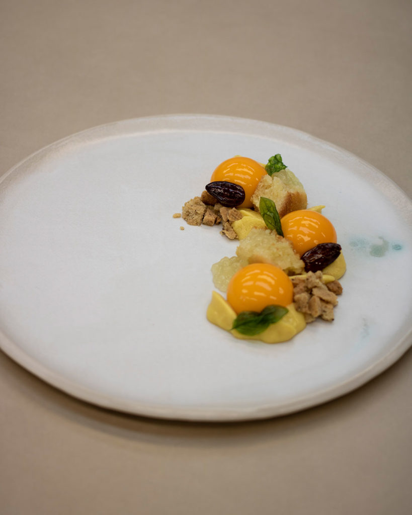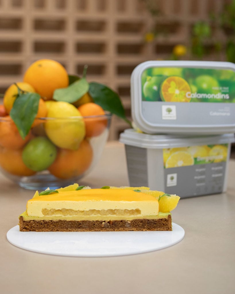 Durante la demostración, elaboramos una tarta y un postre en plato, conformados por las mismas recetas, pero con aplicaciones y acabados distintos. En ambos, los nuevos purés de cítricos de Ravifruit fueron los protagonistas: bergamota y calamansi. Quizá es la primera vez que oyes hablar de estas dos frutas, por eso, te animamos a que investigues un poco ya que resultan dos sabores muy interesantes para incorporar a tus elaboraciones. En el caso de los purés de Ravifruit, las bergamotas proceden de Italia y tienen notas de naranja amarga y lima intensa. Por su parte, los calamansis provienen de Vietnam y aportan un sabor refrescante y suave que podríamos asociar con la mandarina. Interesante, ¿verdad?
