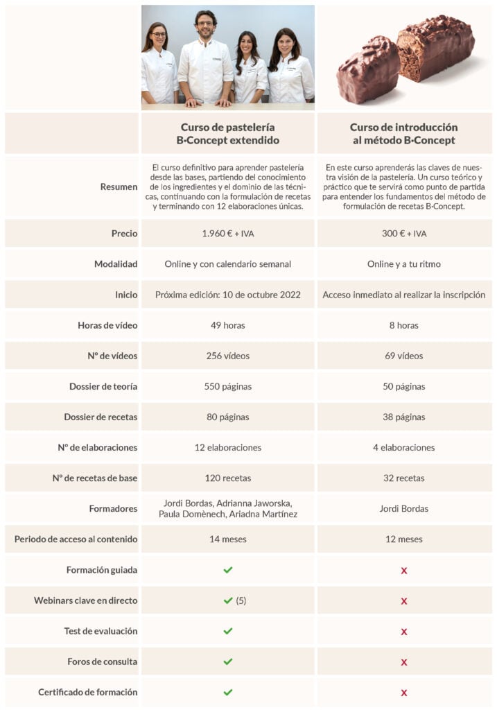 Por otro lado, el Curso de Pastelería B·Concept online y extendido es ideal para aprender repostería desde cero, empezando por conocer todos los ingredientes, dominar las técnicas básicas de pastelería, aprender a formular recetas y crear 12 elaboraciones únicas, algunas de ellas, sin lactosa, sin gluten o veganas.