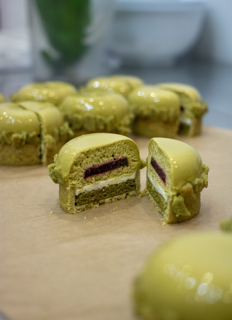 Finalmente, una tartaleta de pistacho, coco y grosella negra. ¡Totalmente vegana! 🌱 Con una combinación de diferentes texturizantes podemos lograr recetas veganas estables y deliciosas y una mousse tan aireada y esponjosa como ésta.