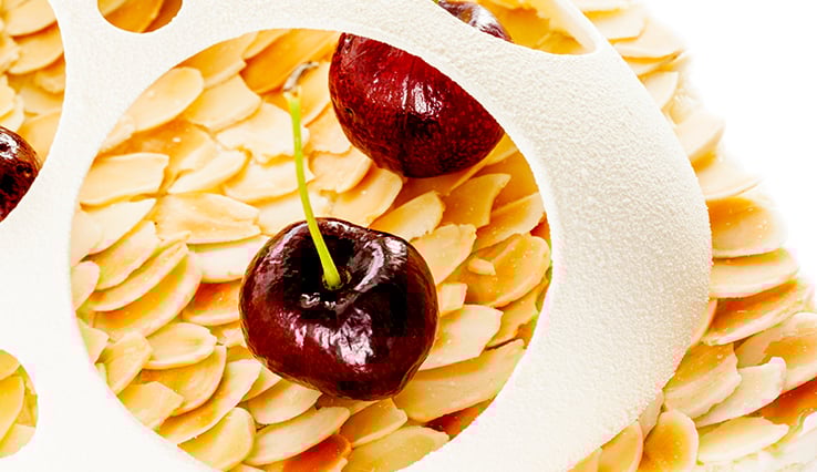 Pintar la otra parte con jarabe de arce y reservar. Colocar una primera capa de esponjoso sobre el bizcocho dentro del molde. Colocar las cerezas con el gelificado sobre el bizcocho y acabar de cubrir con el esponjoso. Colocar el resto de bizcocho a modo de tapa. Desmoldar. Acabar la Sara con una fina capa de esponjoso y cubrirlo con las almendras garrapiñadas.