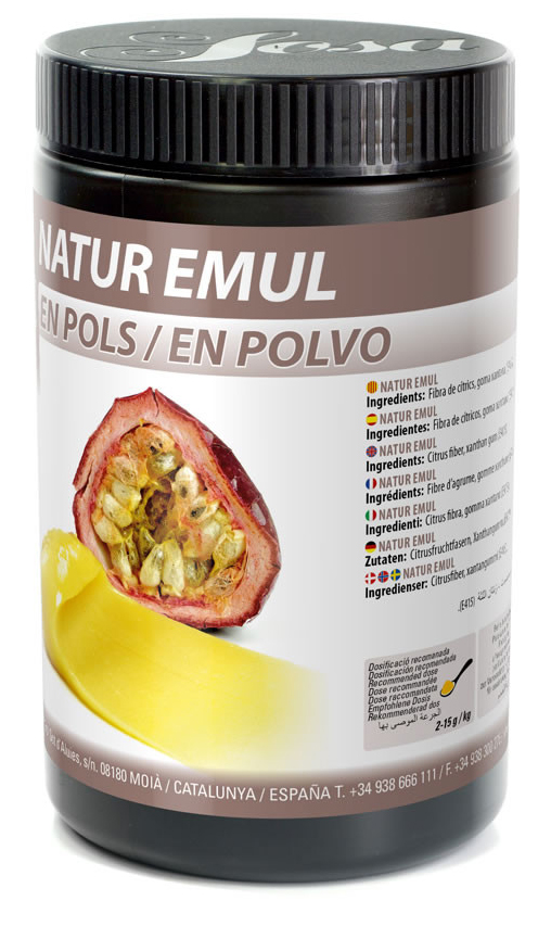 En todos nuestros recetarios hasta octubre de 2019, hemos usado el Natur Emul de Sosa Ingredients (una mezcla de 95% de fibras de cítricos y 5% de goma xantana). Hace un tiempo, Sosa decidió optar por una etiqueta 100% limpia (clean label) y, a partir de octubre de 2019, cambió la formulación de su producto, pasando de una mezcla de fibra de cítricos y goma de xantana a 100% fibra de cítricos. Estamos muy contentos y apoyamos este cambio, ya que también creemos en los productos de etiqueta limpia.