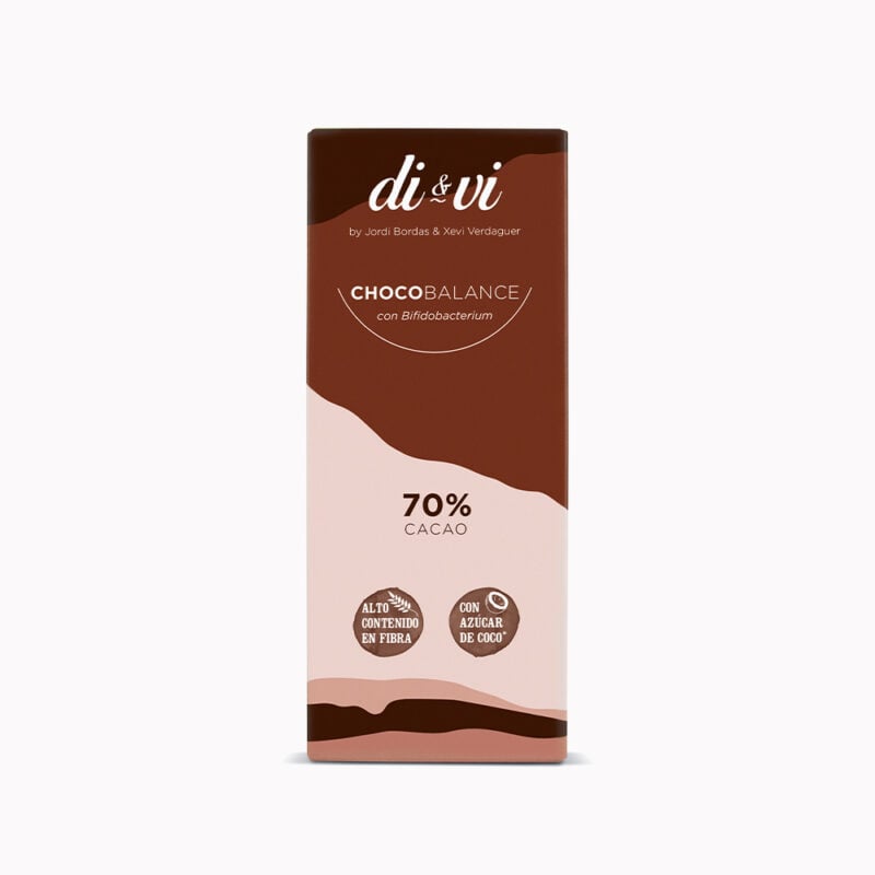 La variedad ChocoBalance 70 % está elaborada con cacao, fibras solubles y Bifidobacterium animalis sub. lactis. Destaca por su intenso sabor a cacao puro, haciendo de esta variedad un chocolate con mucho carácter.
