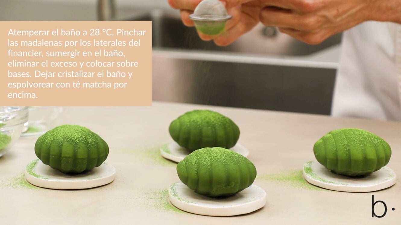 Está compuesto por un financier y un cremoso de té matcha, una mousse de yuzu, un baño de matcha, y una fina capa de té espolvoreado que recubre el individual de maneral sutil y elegante.