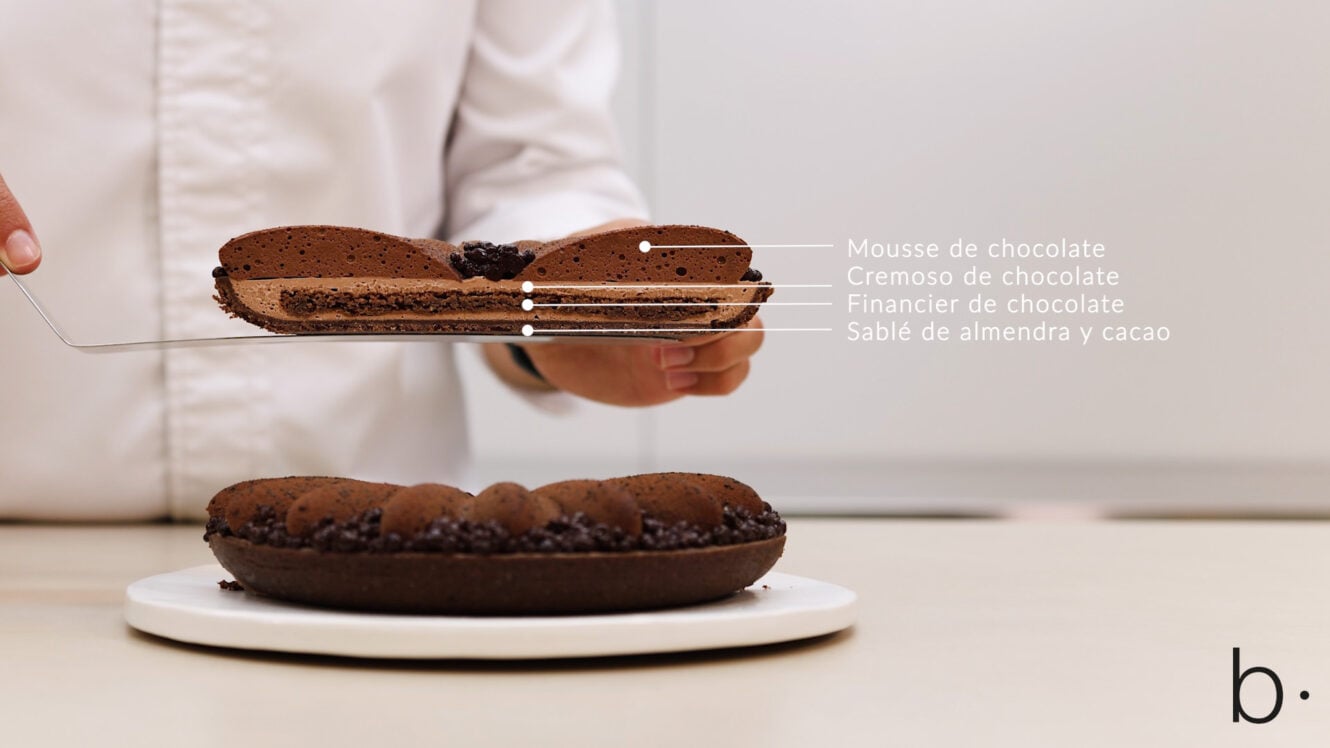 En esta tartaleta hemos querido crear diferentes texturas utilizando siempre la misma materia prima, el chocolate, y potenciando al máximo su sabor combinándolo con ingredientes que conservan y respetan el sabor original.
