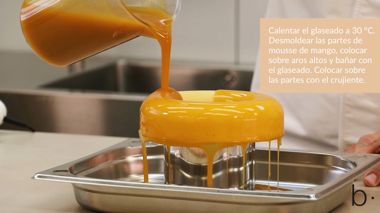 El acabado final de este entremets lo conseguimos jugando con un glaseado y una brunoise de mango fresco, junto con láminas de coco y semillas de fruta de la pasión.