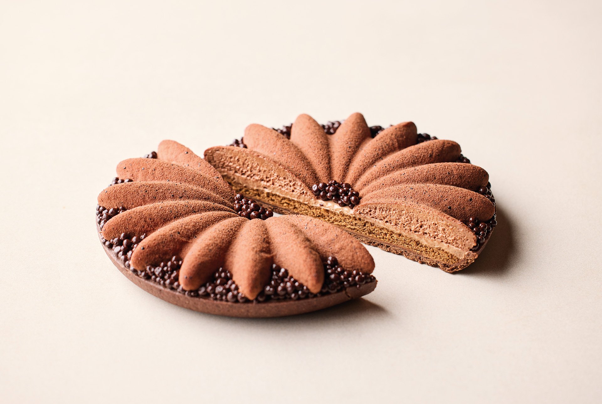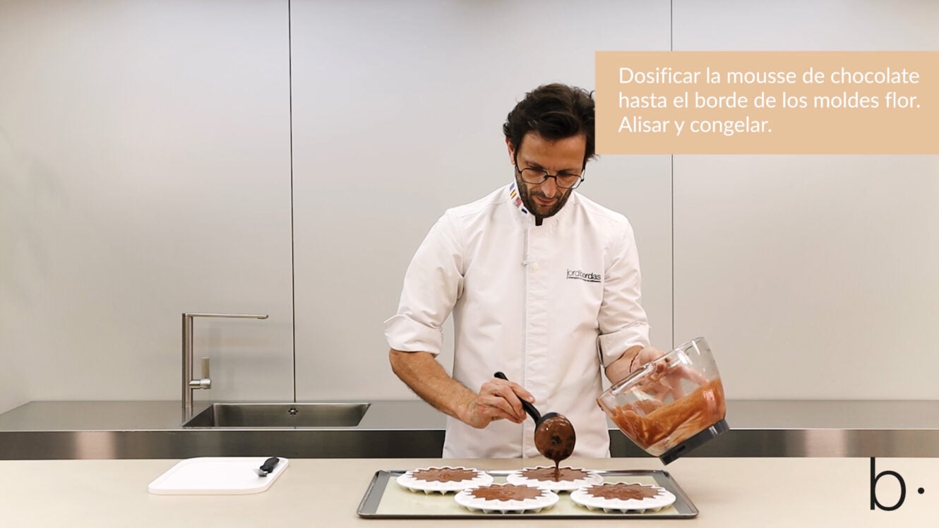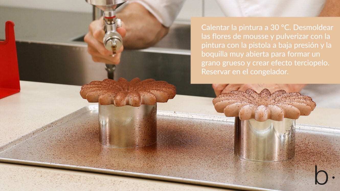Las texturas de esta elaboración son: un sablé de cacao, un cremoso y financier de chocolate 40%, una mousse de chocolate 70%, caviar de cacao y finalmente, un glaseado y una pintura de chocolate con la que decoramos la flor para conseguir un efecto terciopelado.