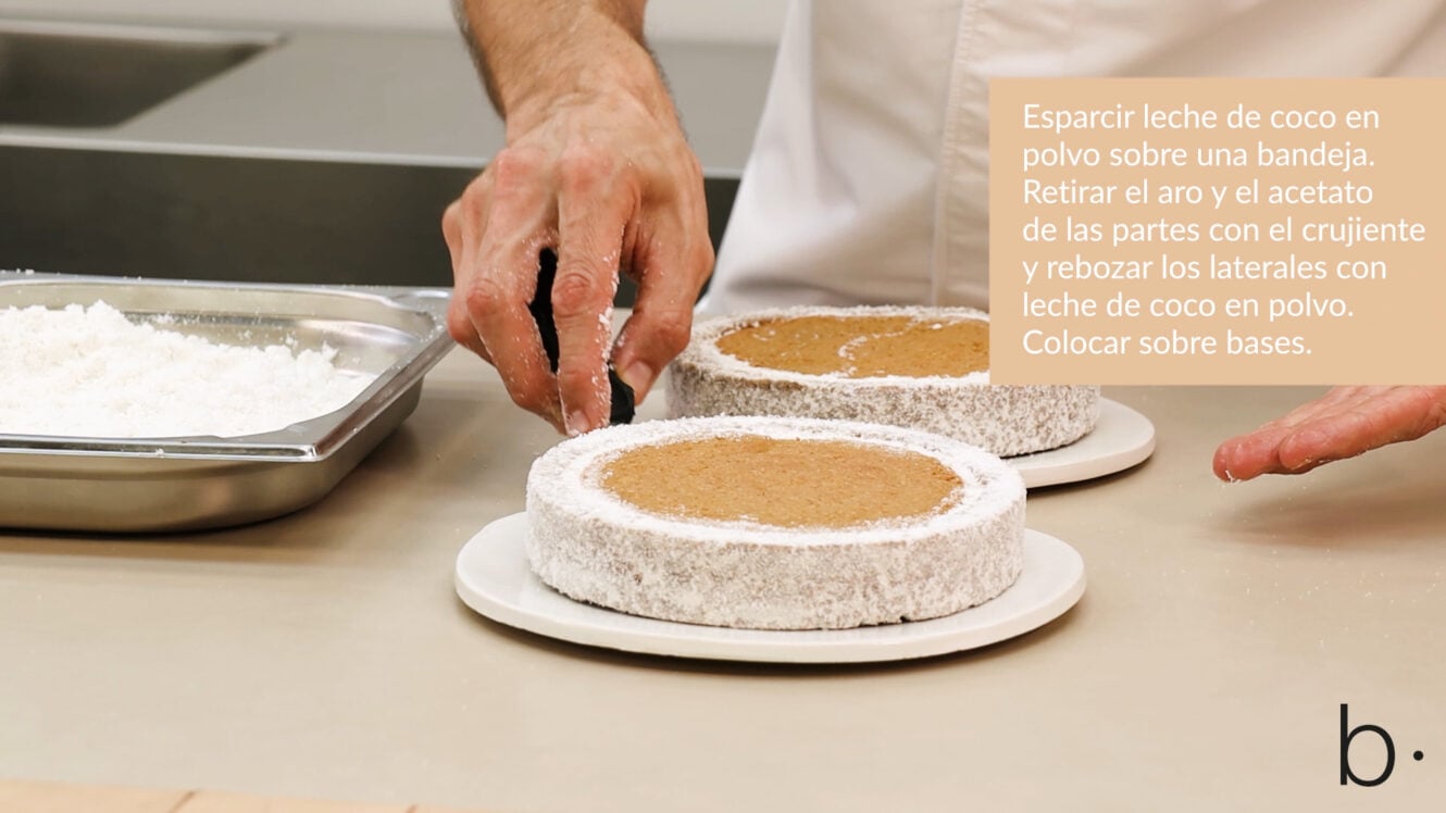 Las diferentes texturas de abajo hacia arriba son: un crujiente de coco, una dacquoise y mousse de coco, y un cremoso que combina sabores tropicales y ácidos de plátano, mango, fruta de la pasión y coco.